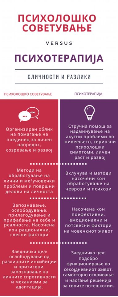 Грижата за своето ментално и физичко здравје е несомнено основен сегмент за одржување на субјективната добросостојба. Психолошката поддршка како формална форма на негување на менталното здравје е се по популарна и на нашите простори и да се оди на психолог веќе не е табу. Психолошкото советување и психотерапијата се психолошки услуги што се достапни за јавноста кај лиценциран психолог или психијатар кој завршил соодветна обука за психотерапија. Што всушност е психотерапијата, а што психолошкото советување? Кога ми е потребна психотерапија? Дали воопшто има разлика? Тоа се прашања кои често се поставуваат од страна на клиентите, а поставувањето на јасна граница понекогаш е тешка и за специјалистите од оваа област.